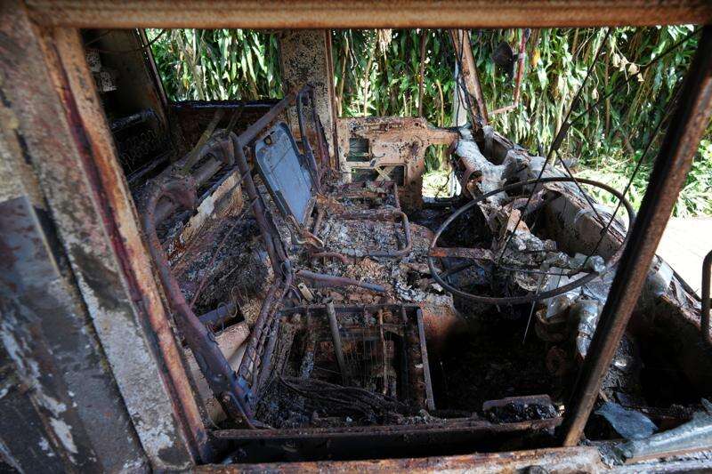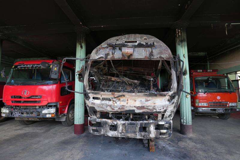 In this photo taken during a trip supervised by pro-military Myanmar media, a damaged fire engine is seen at the Fire Service Department building in Kyaukme, northern Shan State, Myanmar, Friday, Oct. 10, 2025. (AP Photo/Aung Shine Oo)