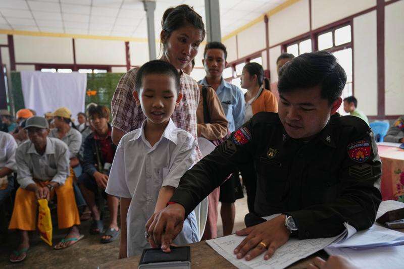 In this photo taken during a trip supervised by pro-military Myanmar media, an Immigration officer notes personal data of locals for lost and damaged national registration cards, at their temporary office, in Kyaukme, northern Shan State, Myanmar, Friday, Oct. 10, 2025. (AP Photo/Aung Shine Oo)