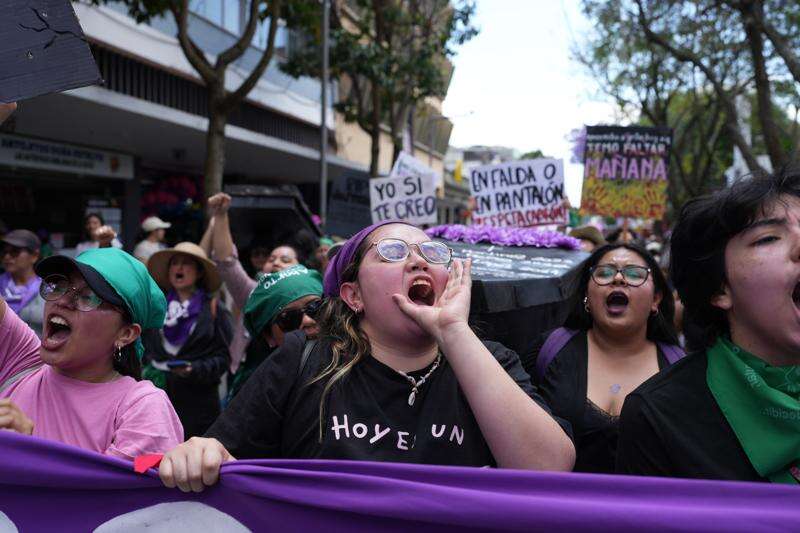 People rally for International Women's Day in Guatemala City, Sunday, March 8, 2026. (AP Photo/Moises Castillo)