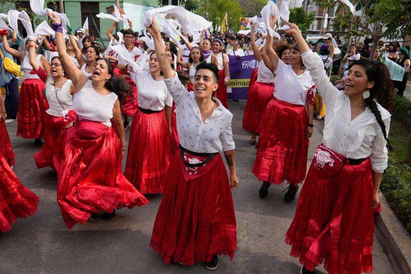 Women perform a good luck ceremony before a march marking International Women's Day, in Lima, Peru, Saturday, March 7, 2026. (AP Photo/Martin Mejia)