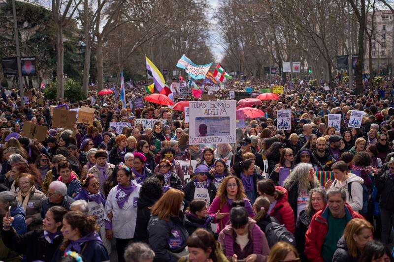 A woman takes part in an International Women's Day protest in Madrid, Spain, Sunday, March 8, 2026. (AP Photo/Manu Fernandez)