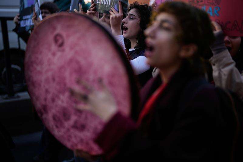 Women shout slogans as they march during a protest marking the International Women's Day, in Istanbul, Turkey, Sunday, March 8, 2026. (AP Photo/Khalil Hamra)