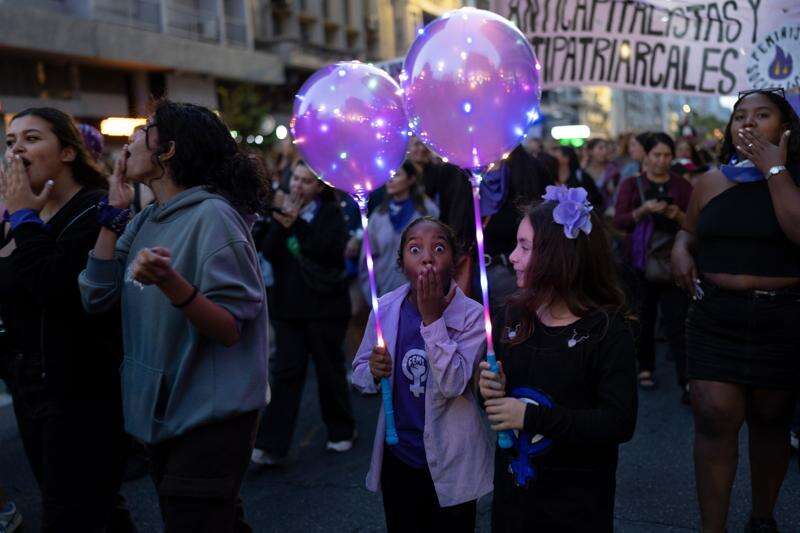 People celebrate International Women's Day in downtown Montevideo, Uruguay, Sunday, March 8, 2026. (AP Photo/Matilde Campodonico)