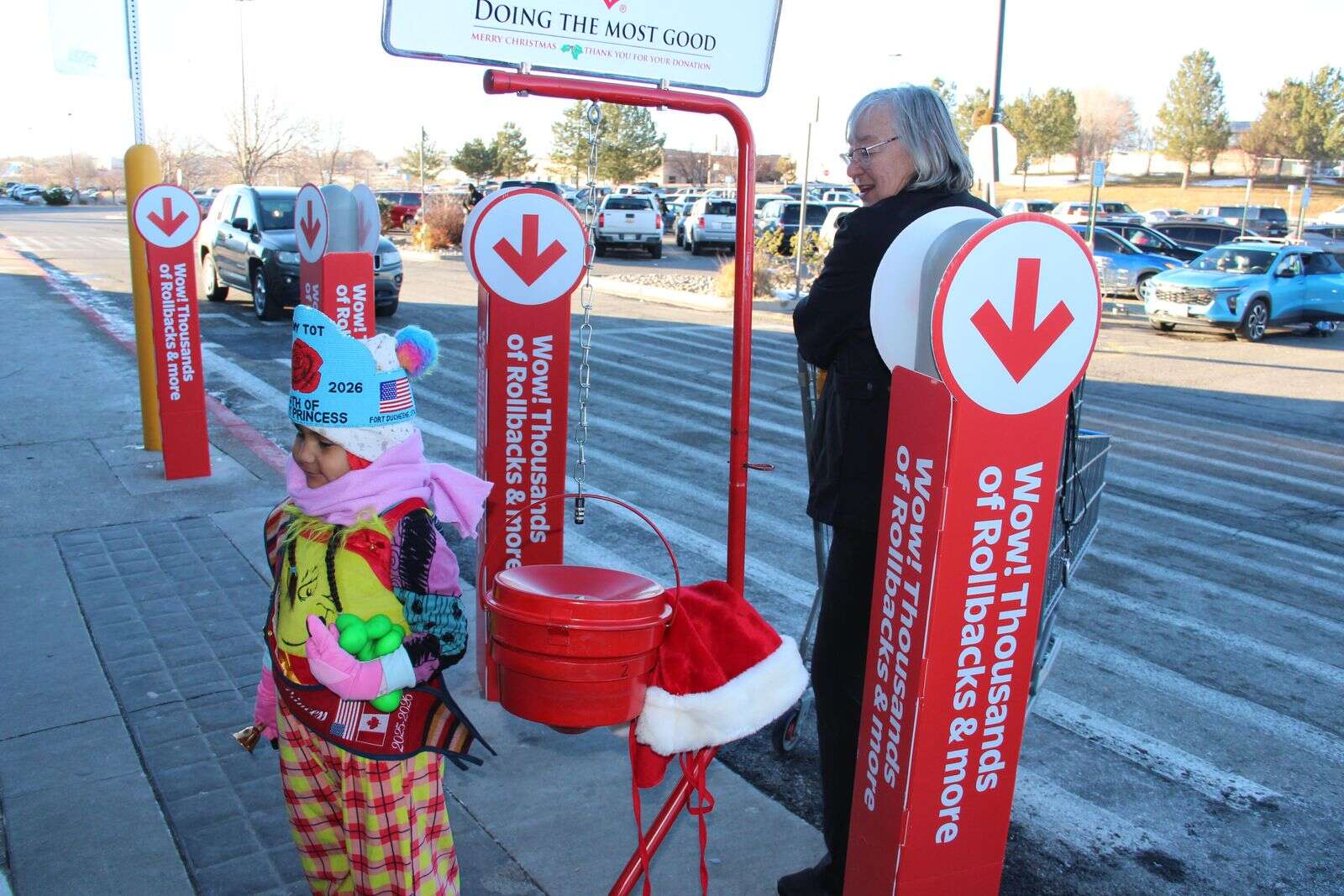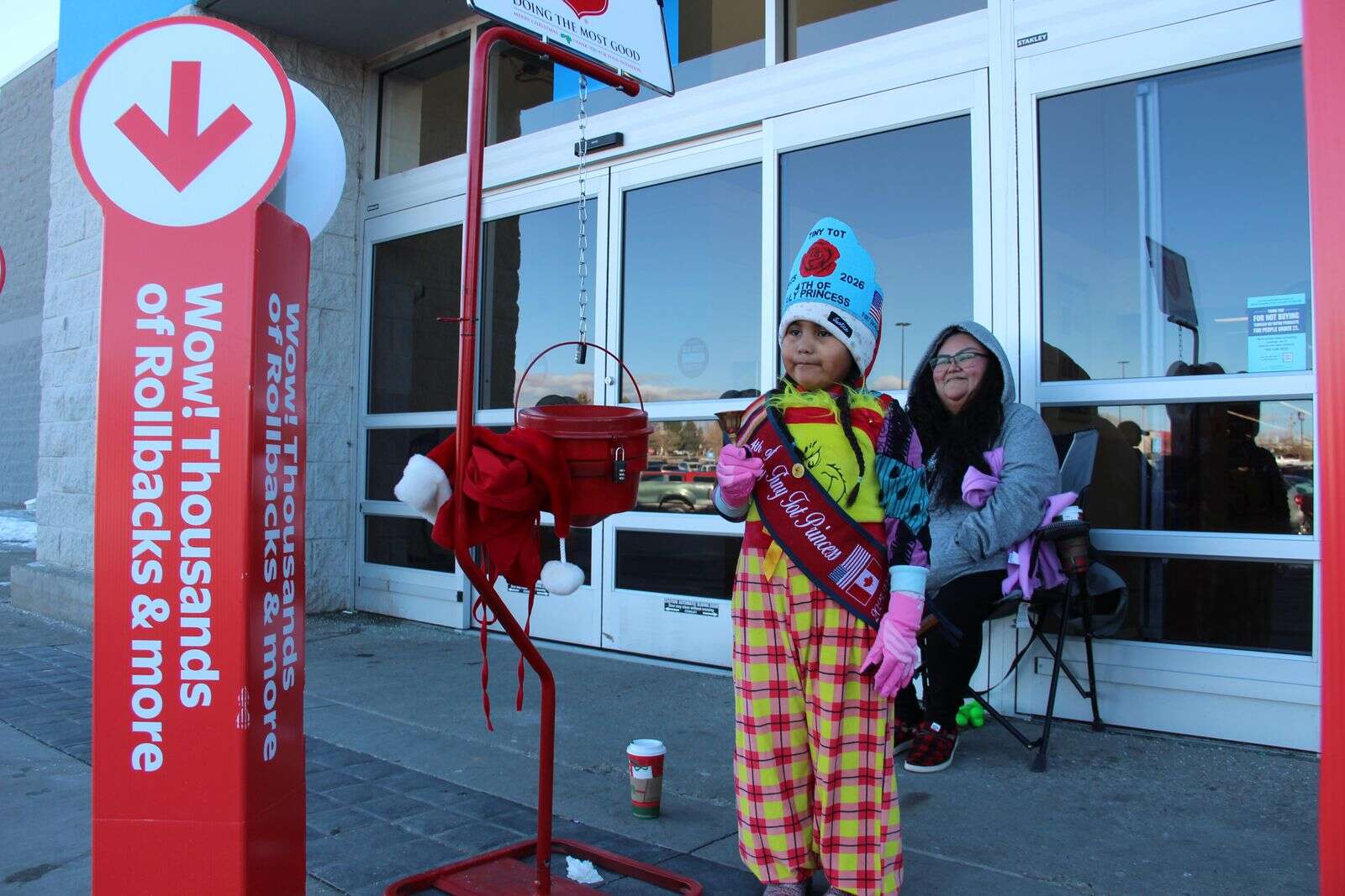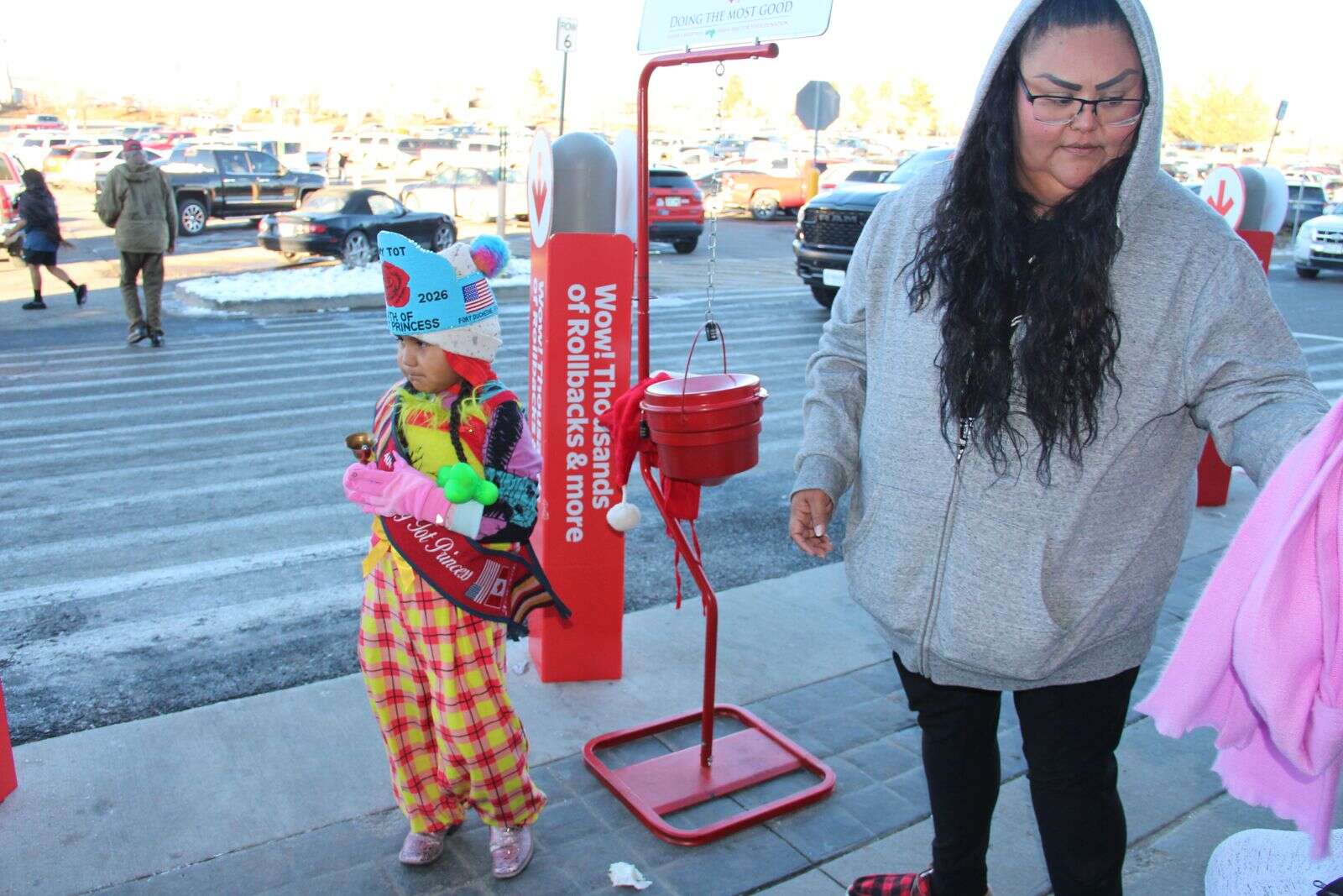 Bonnii Height, 5, a Ute Mountain Ute tribal member, won the “Tiny Top Fourth of July Princess” title at the Fort Duchesne, Utah, Powwow this year. Now considered tribal royalty and serving as a cultural ambassador, she rang a bell for The Salvation Army outside Walmart in Cortez on Dec. 5, accompanied by her adoptive mother, Trisheena Height. (Benjamin Rubin/The Journal)