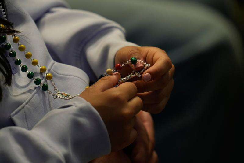 Leo presided over the service sitting off to the side of the altar on a white throne, wearing his formal red cape and liturgical stole and praying with a Rosary in his hands. Many of the priests and nuns in the pews fingered Rosary beads as the “Our Father” and “Hail Mary” prayers were recited.