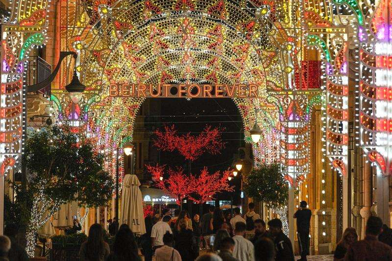 FILE - People walk past Christmas decorations in downtown Beirut, Lebanon, Wednesday, Nov. 26, 2025. (AP Photo/Hussein Malla, File)