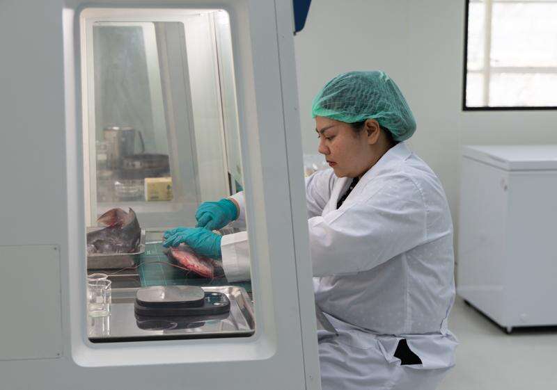 In a lab, she uses a scalpel to point out tell-tale signs of contamination — tumor-like growths, discolored scales, and unusual eye coloration — before dissecting a catfish caught from the Kok River.