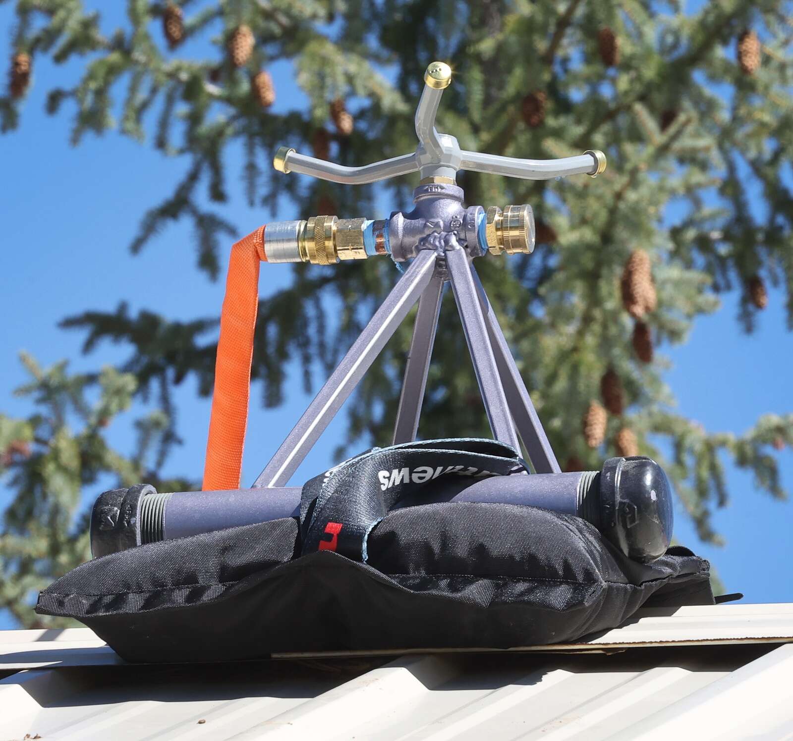 Studies have shown that 90% of structures that burn in a wildfire do so because an ember blowing off the approaching blaze lands on the structure. Unlike their garden-variety cousins, the Glanzes’ sprinklers are meant to stop an ember from landing on and igniting a house.