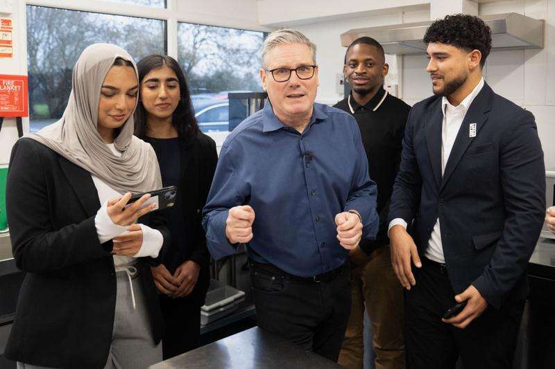 Britain's Prime Minister Keir Starmer, center, speaks with locals, during a visit to a community group at Flaunden Village Hall to discuss the government's Warm Homes Plan, in Flauden, Hertfordshire, England, Thursday, Jan. 22, 2026. (Stefan Rousseau, Pool Photo via AP)