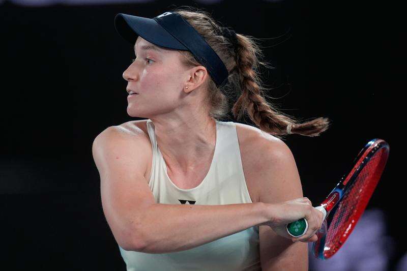 Elena Rybakina of Kazakhstan plays a forehand return to Jessica Pegula of the U.S. during their semifinal match at the Australian Open tennis championship in Melbourne, Australia, Thursday, Jan. 29, 2026. (AP Photo/Asanka Brendon Ratnayake)