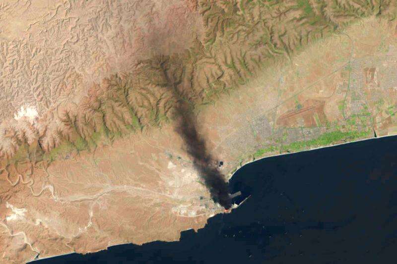 DUBAI, United Arab Emirates (AP) — Satellite images are beginning to be released giving a glimpse into the toll of the Iran war, with ships ablaze in an Iranian port and destroyed buildings at an American base.