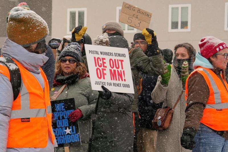 Peter Noble joined dozens of other U.S. Post Office workers Sunday on their only day off from their mail routes to march against the immigration crackdown. They passed by the place where an immigration officer shot and killed Renee Good, a U.S. citizen and mother of three, during a Jan. 7 confrontation.