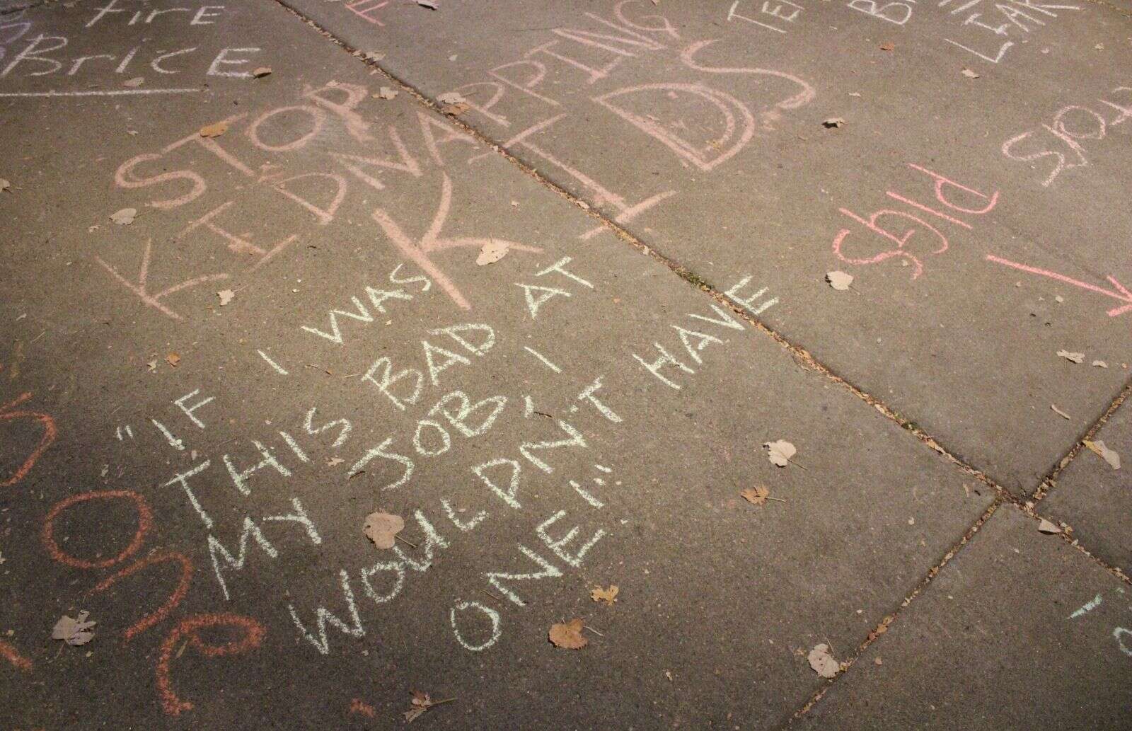Residents chanted “serve and protect” at officers. Some had written phrases criticizing ICE and demeaning the police chief in chalk outside City Hall.