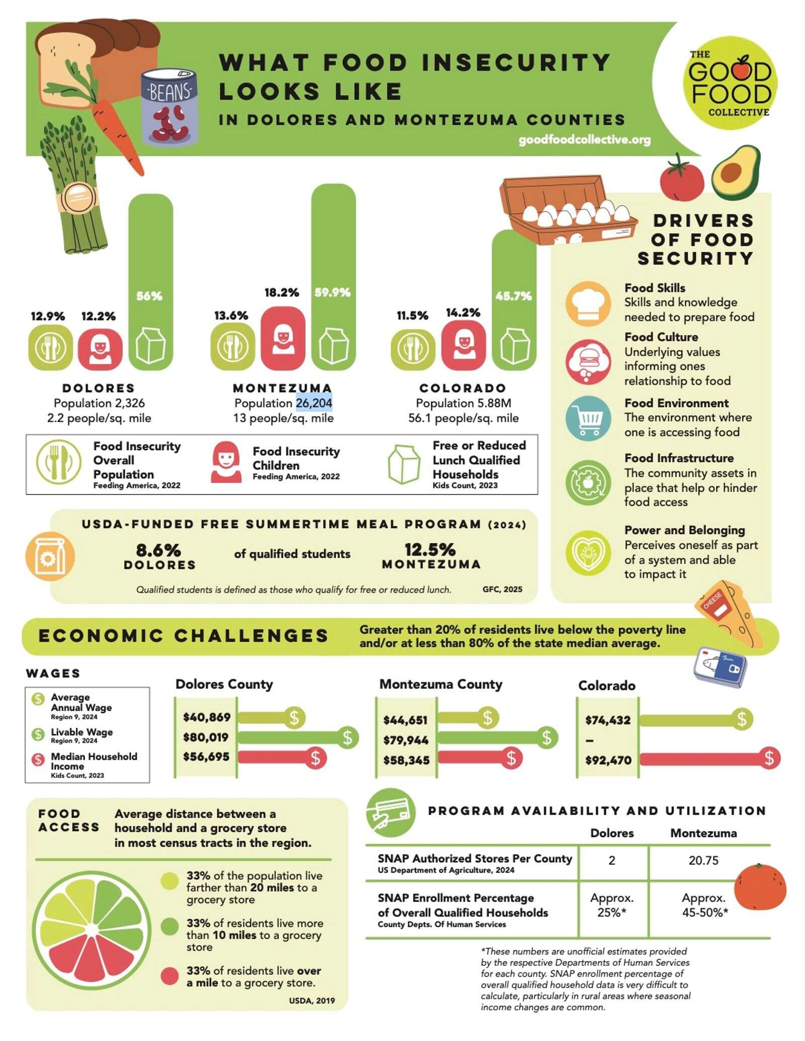 The graphic details local data: 13.6% of Montezuma County residents and 18.2% of children experience food insecurity, with more than half of households qualifying for free or reduced lunches. (Graphic courtesy of the Good Food Collective)