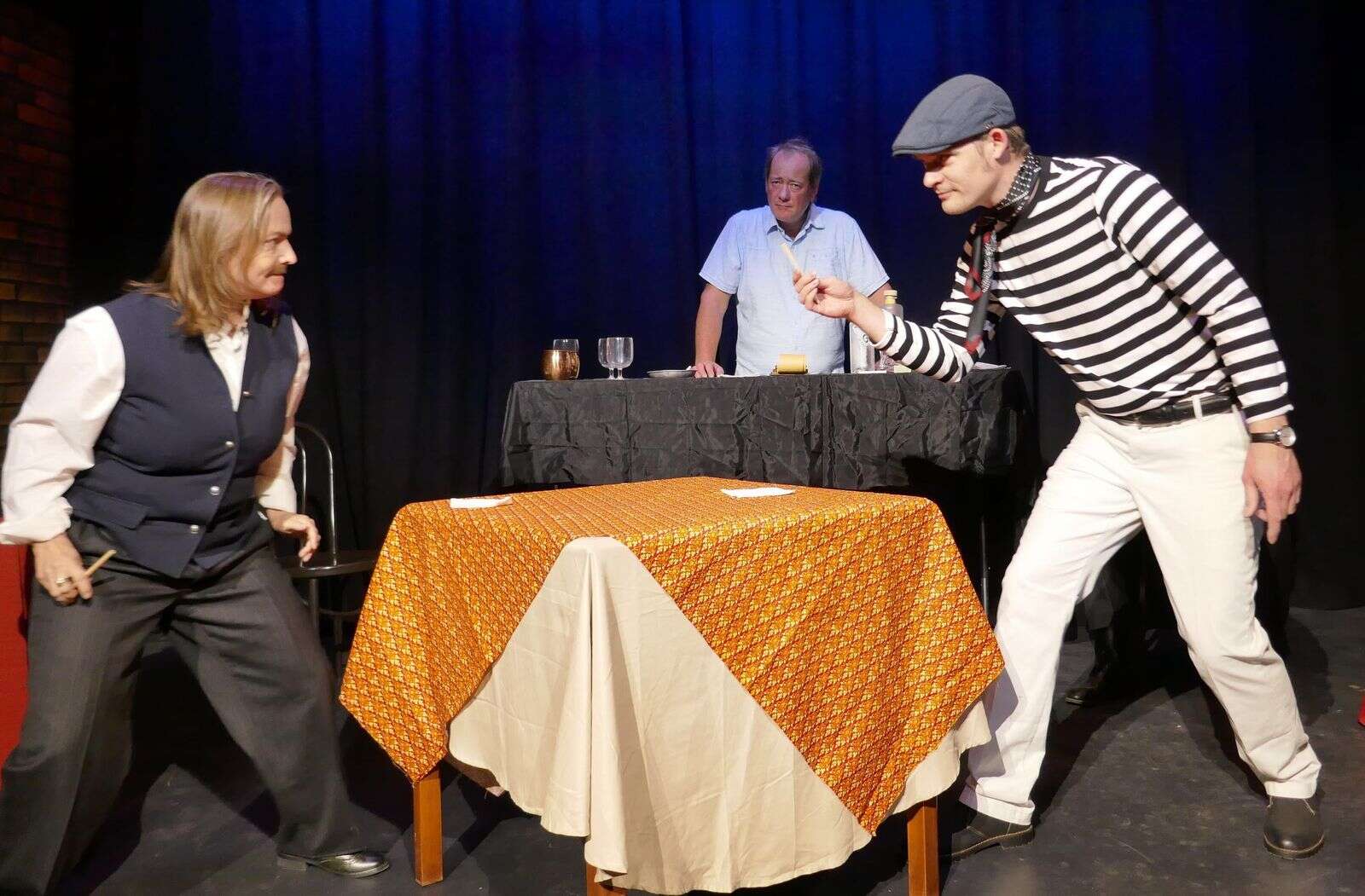 Albert Einstein, played by Elizabeth Dickey, and Pablo Picasso, played by Aaron Lesse, face off in a contest of geniuses in “Picasso at the Lapin Agile.” The show will be held at the Mancos Opera House in May. (Courtesy of Heidi Brugger)