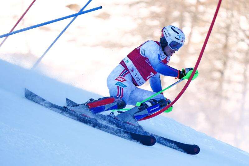 Norway's Henrik Kristoffersen speeds down the course during an alpine ski, men짜s World Cup slalom event, in Val d짜Isere, France, Sunday Dec. 14, 2025. (AP Photo/Pier Marco Tacca)