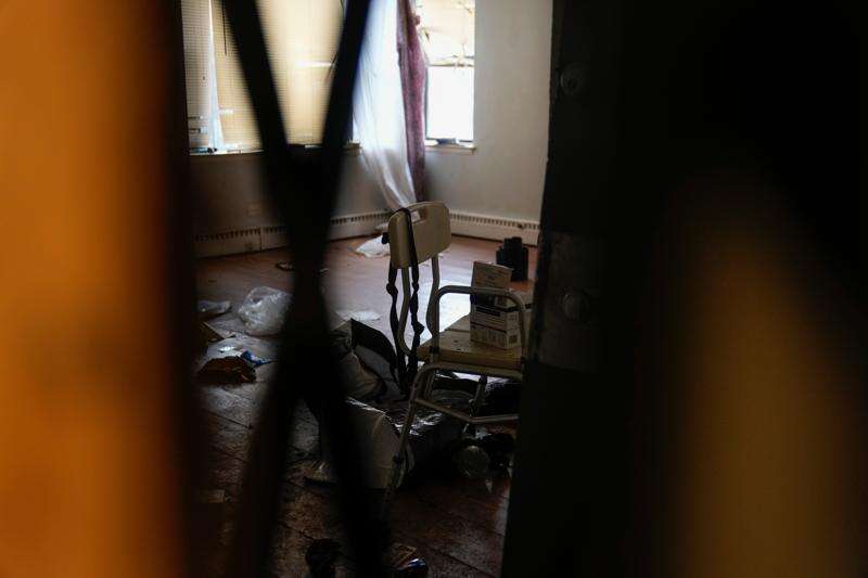Items are seen on Oct. 10, 2025, in a boarded-up apartment with broken windows inside the building at 7500 South Shore Drive in Chicago, which was raided by federal agents on Sept. 30. (AP Photo/Erin Hooley)