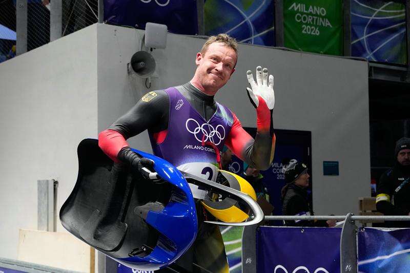 Germany's Felix Loch waves as he arrives at the finish during a men's single luge run at the 2026 Winter Olympics, in Cortina d'Ampezzo, Italy, Sunday, Feb. 8, 2026. (AP Photo/Alessandra Tarantino)