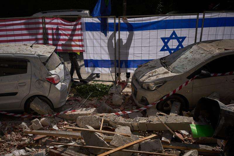 Israeli authorities hang Israeli and U.S. flags at the site struck by an Iranian missile that killed two people, in Ramat Gan, Israel, Wednesday, March 18, 2026. (AP Photo/Oded Balilty)