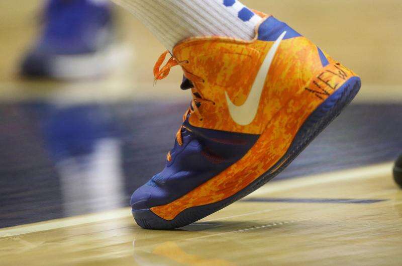 FILE - Nike sneakers are seen during the second half of an NCAA college basketball game between Florida and Alabama in the semifinals of the Southeastern Conference tournament, Saturday, March 16, 2013, in Nashville, Tenn. (AP Photo/John Bazemore, File)