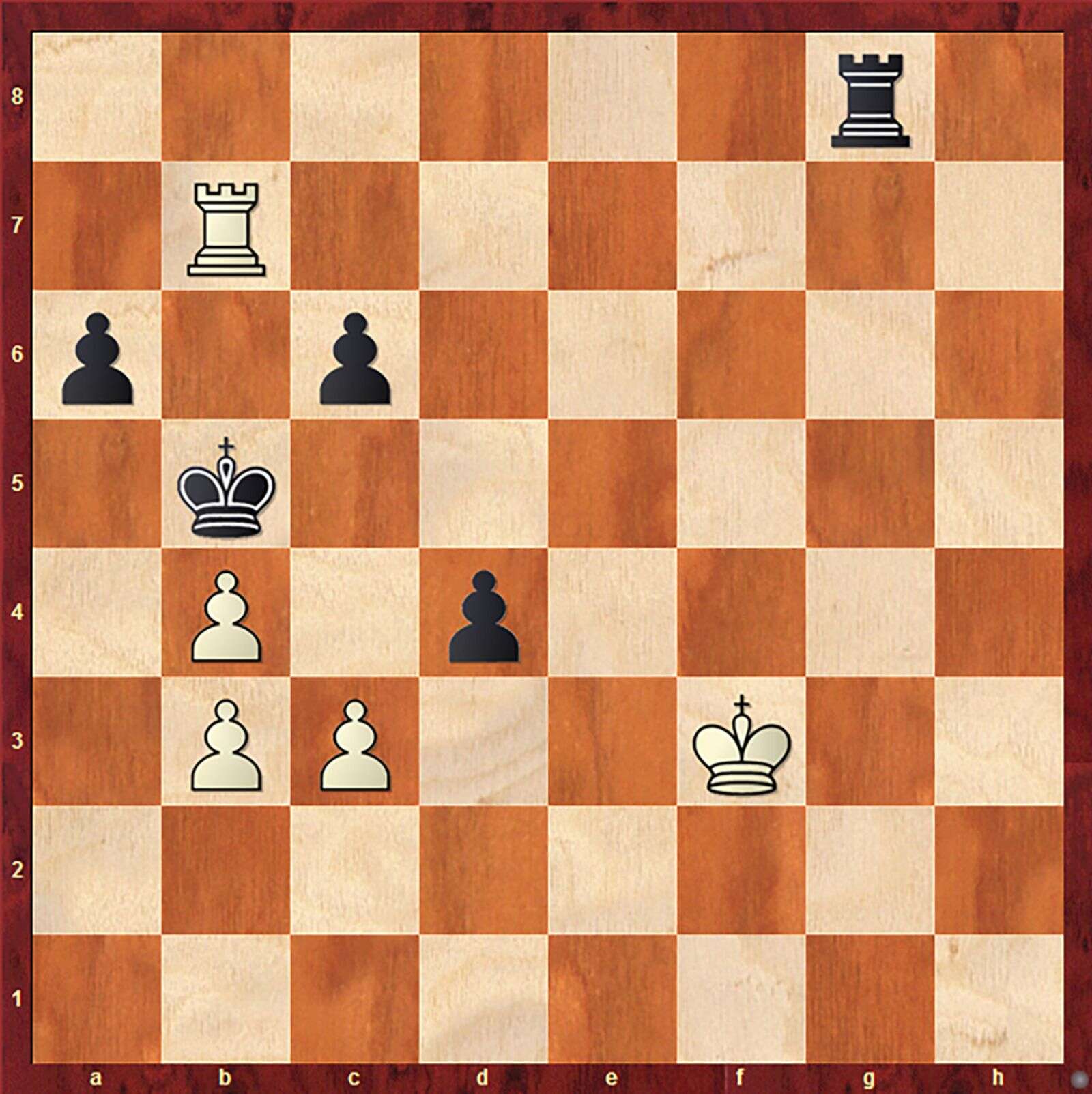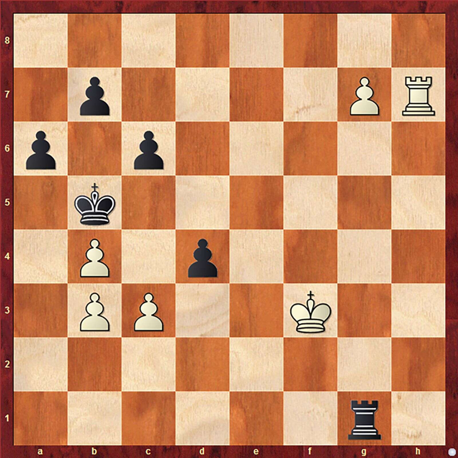 White’s pawn is on the verge of promotion, but black’s rook keeps its eye safely on the pawn. Nevertheless, the pawn promotes, and black’s rook snatches the new queen. White’s rook then captures black’s b7 pawn (see next diagram).