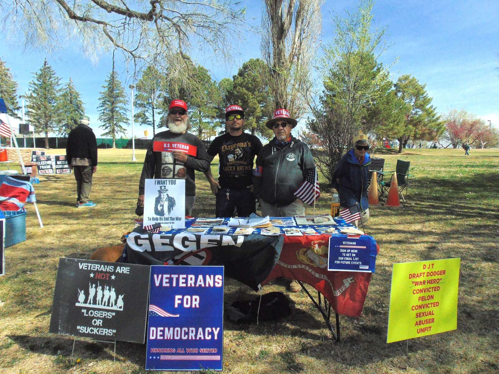 A group of veterans tabled for the No Kings protest in Cortez on Saturday, citing opposition to the war in Iran as their motivation for coming. (Ann Marie Vanderveen/The Journal)