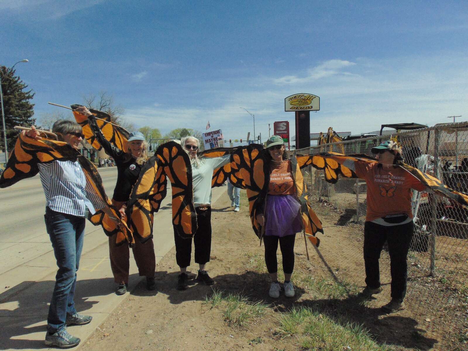 Angela Atkinson (second from right) and her fellow co-organizers of Diginity Project received chuckles and praise for their “orange monarch” costumes at the No Kings protest in Cortez on Saturday. (Ann Marie Vanderveen/The Journal)