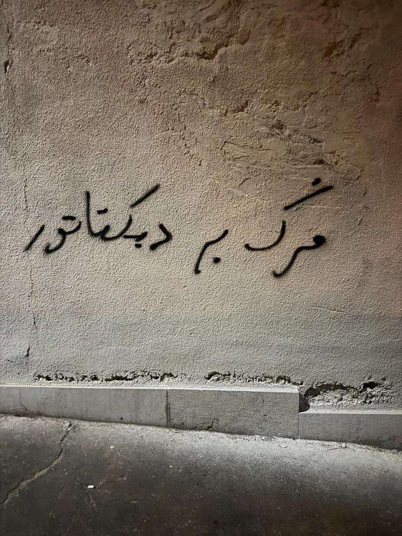 In this photo obtained by The Associated Press, a slogan is written on a wall reading in Farsi, "Death to dictator" during an anti-government protest in Tehran, Iran, Saturday, Jan. 10, 2026. (UGC via AP)