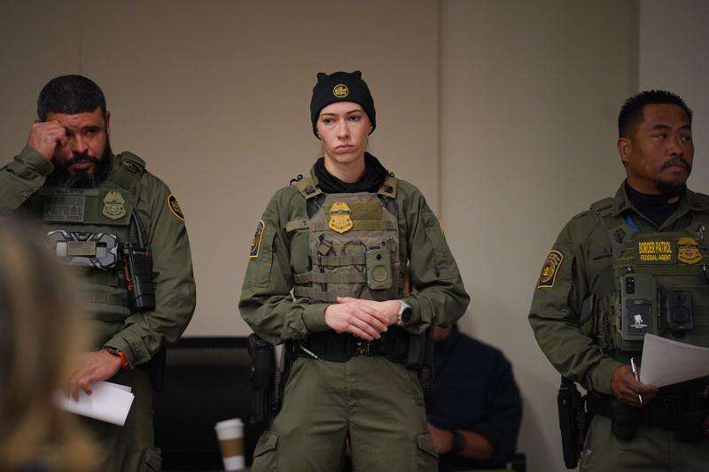 Federal agents look on as White House border czar Tom Homan holds a news conference at the Bishop Whipple Federal building on Wednesday, Feb. 4, 2026 in Minneapolis. (AP Photo/Ryan Murphy)