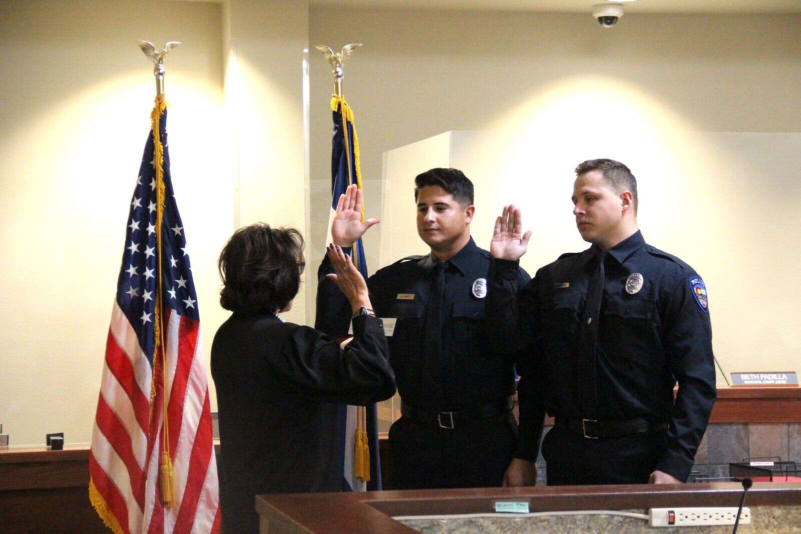 After months of academy training away from home, two Cortez police officers took the oath Tuesday morning, officially joining the department in a City Hall swearing-in ceremony.