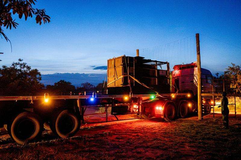 A truck carrying a rhinoceros in a transportation crate arrives at Kidepo Valley National Park in north-eastern Uganda, Tuesday, March 17, 2026. (AP Photo/Moses Dipak)