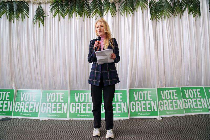 Green Party candidate for the Gorton and Denton by-election Hannah Spencer speaks in Manchester, England, Friday, Jan. 30, 2026. (AP Photo/Jon Super)