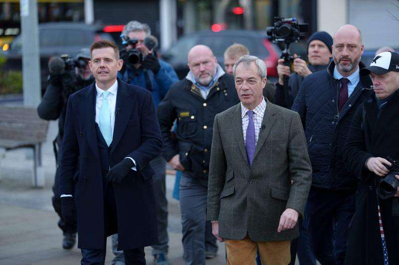 Reform leader Nigel Farage, centre right, walks with prospective candidate Matt Goodwin, left, during a campaign visit to Gorton and Denton in Manchester, England, Friday, Jan. 30, 2026. (AP Photo/Jon Super)