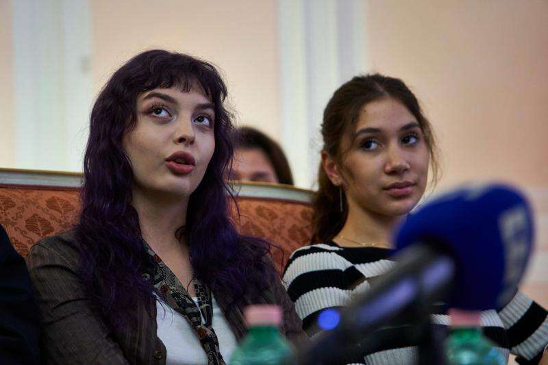 Marta Hlazkova, left, and Veronika Vlasova attend a press conference on the return of Ukrainian children and civilians taken by Russia during the three-and-a-half-year war, at the Embassy of Ukraine in Italy, in Rome, Wednesday, Nov. 19, 2025. (AP Photo/Domenico Stinellis)