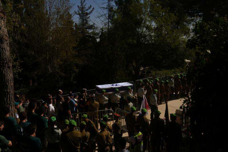 Israeli servicemen carry the coffin of comrade Major Yaniv Kola, who was killed in the Gaza Strip, during his funeral at Mt. Herzl military cemetery in Jerusalem, Monday, Oct. 20, 2025. (AP Photo/Francisco Seco)
