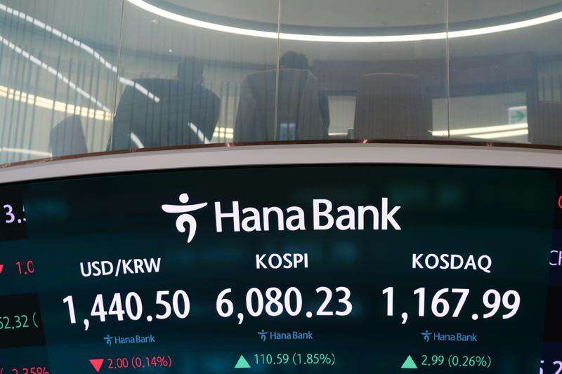 People sit on the chairs near the screens showing the Korea Composite Stock Price Index (KOSPI), center, the foreign exchange rate between U.S. dollar and South Korean won, left, and the Korean Securities Dealers Automated Quotations (KOSDAQ) at a dealing room of Hana Bank in Seoul, South Korea, Wednesday, Feb. 25, 2026. (AP Photo/Lee Jin-man)