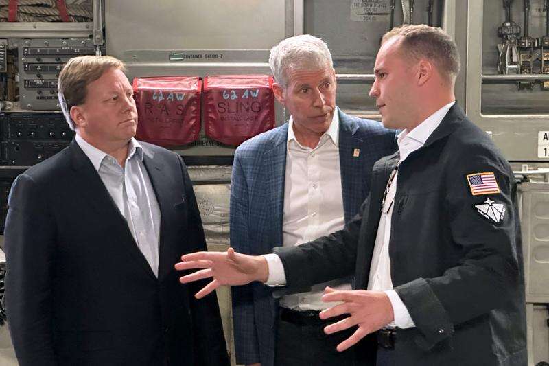 Energy Secretary Chris Wright, center, tours a C-17 military aircraft as a microreactor was transported from March Air Reserve Base, Calif., to Hill Air Force Base in Utah, Sunday ,Feb. 15, 2026. (AP Photo/Matthew Daly)