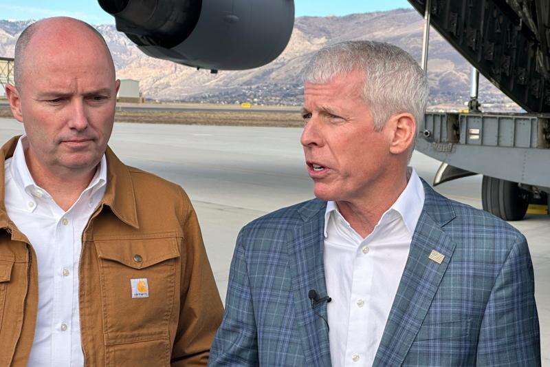 Energy Secretary Chris Wright, right, speaks as Utah Gov. Spencer Cox listens, following a news conference at Hill Air Force Base, Utah. Wright and other officials were onboard as a Valar Atomics microreactor, without nuclear fuel, was transported from March Air Reserve Base in California to Hill Air Force Base. Cox met the plane in Utah. (AP Photo/Matthew Daly)