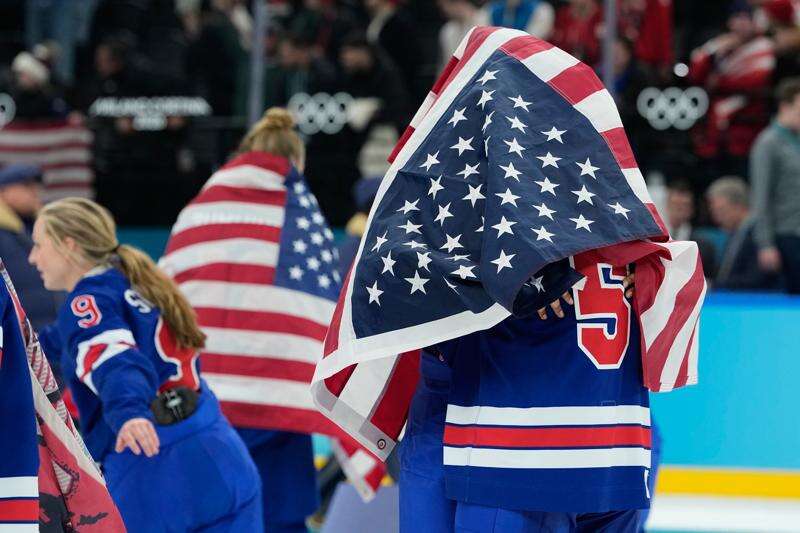 U.S. players celebrate after a semifinal match of women's ice hockey between the United States and Sweden at the 2026 Winter Olympics, in Milan, Italy, Monday, Feb. 16, 2026. (AP Photo/Petr David Josek)
