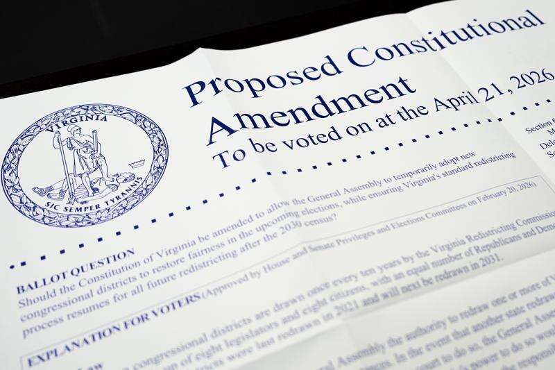 A poster on the Virginia redistricting referendum is seen during voting at Mason Square, Tuesday, April 21, 2026, in Alexandria, Va. (AP Photo/Julia Demaree Nikhinson)