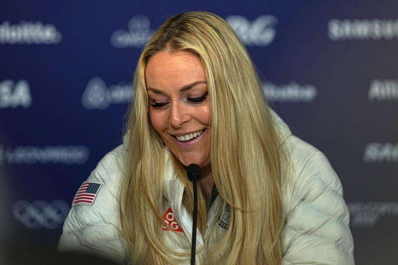 United States' Lindsey Vonn attends a press conference by the U.S. ski team at the 2026 Winter Olympics, in Cortina d'Ampezzo, Italy, Tuesday, Feb. 3, 2026. (AP Photo/Fatima Shbair)