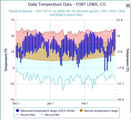Durango recorded above-average temperatures this winter, with record highs in December and February and much of January temperatures in the high 40s and low 50s, according to National Weather Service data.