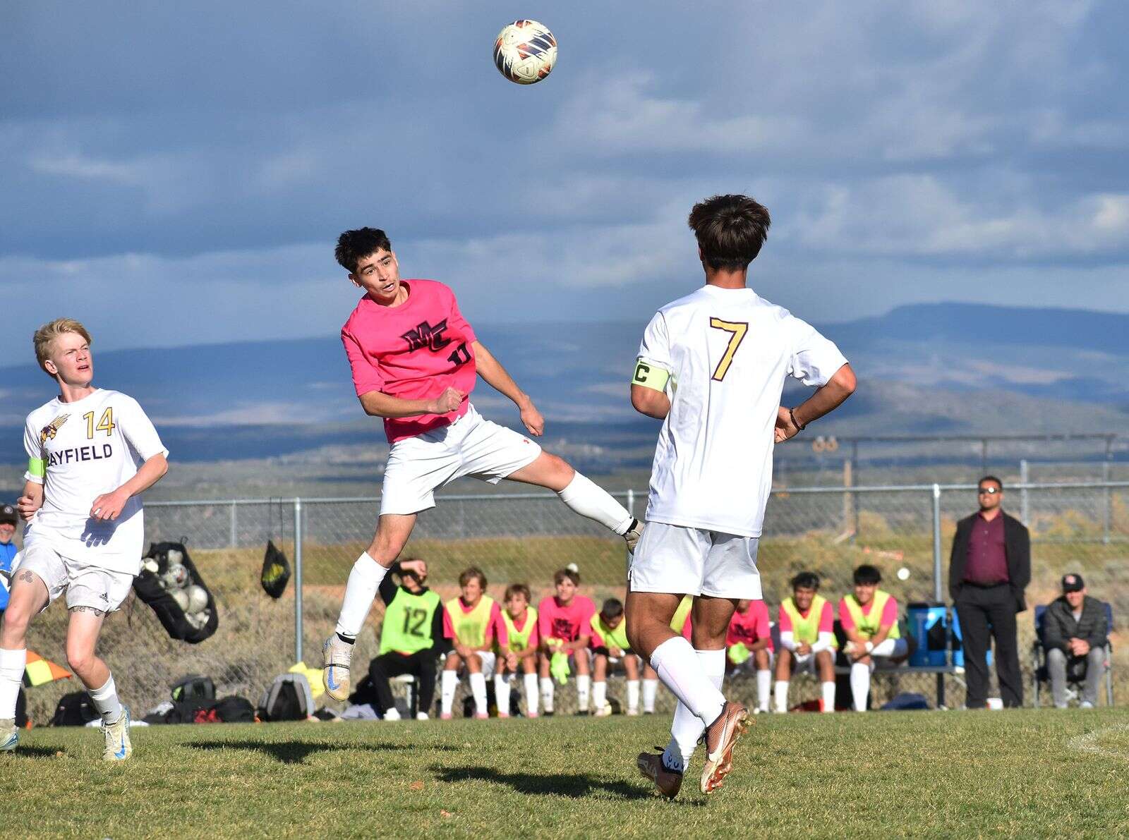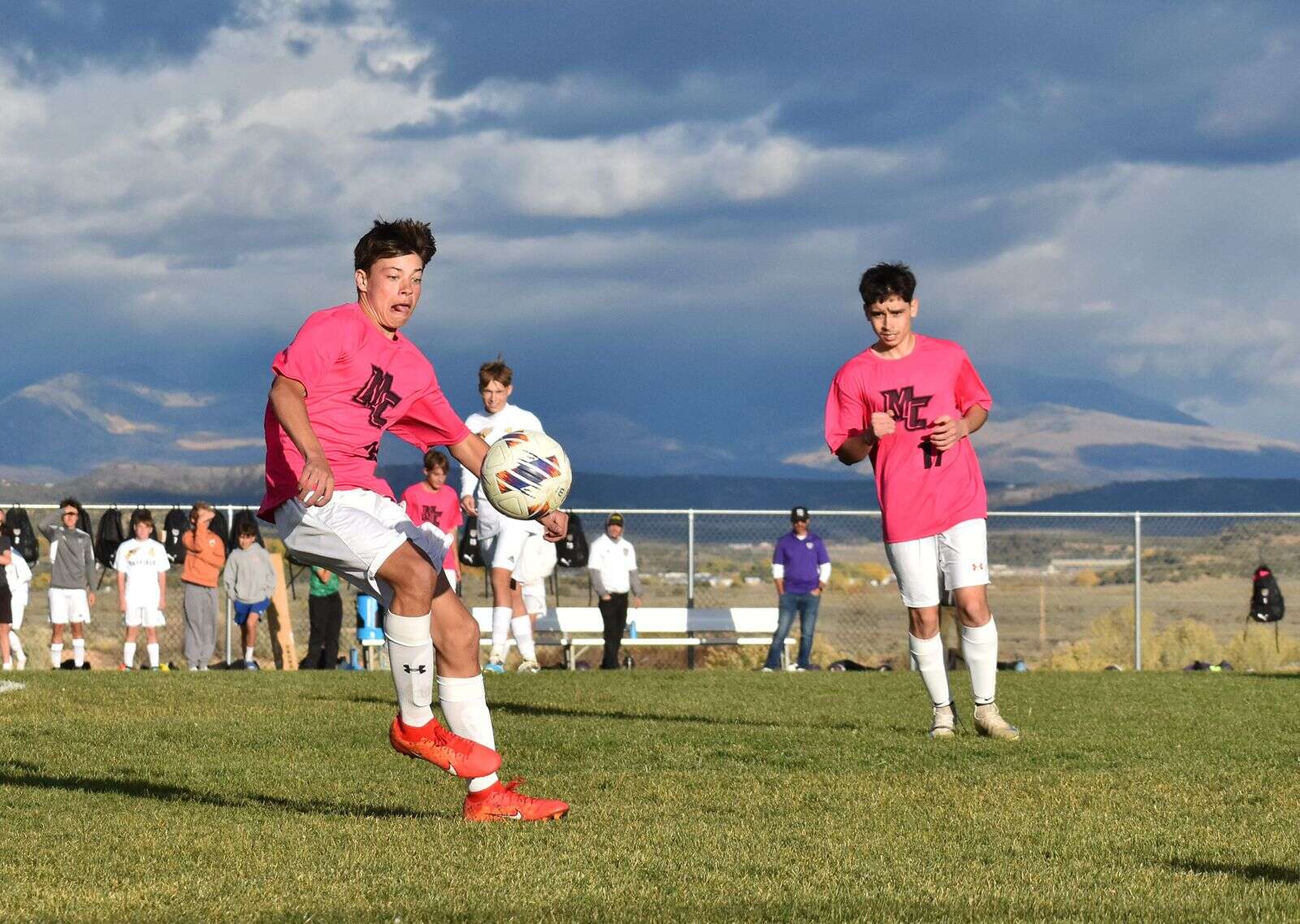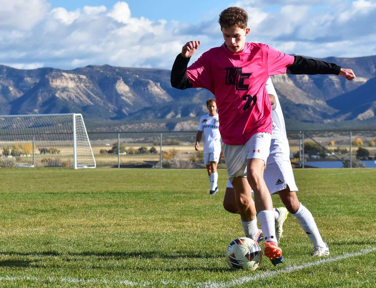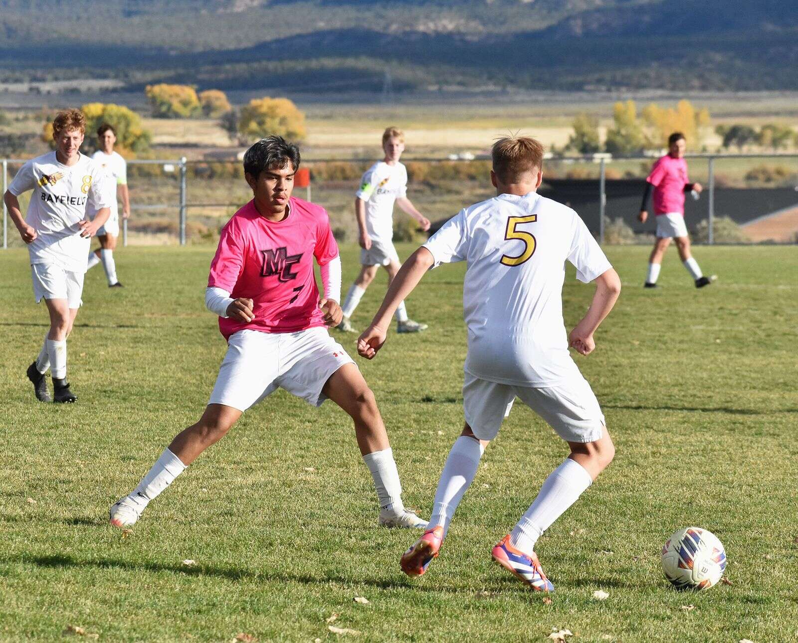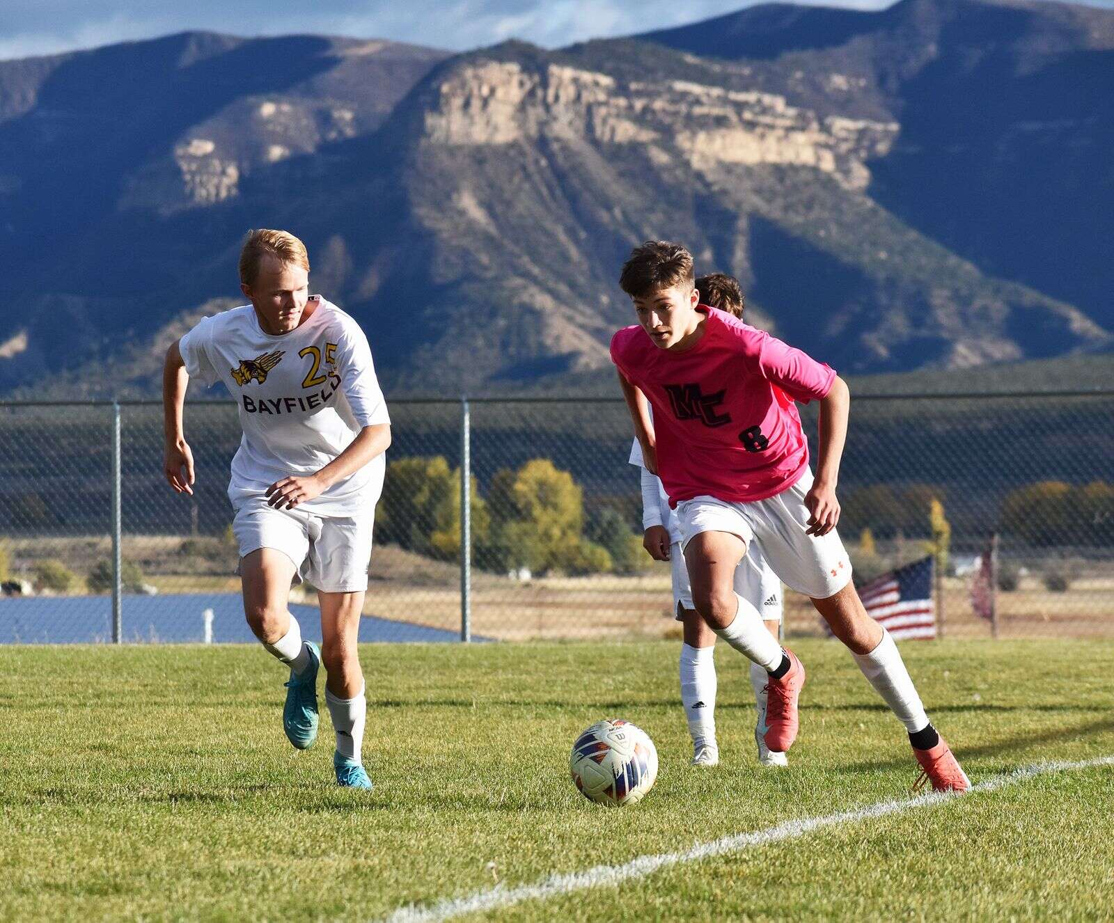Montezuma-Cortez freshman Landon Yarbrough drives forward with the ball in a match against Bayfield on Friday afternoon. Erika Alvero/Special to The Journal
