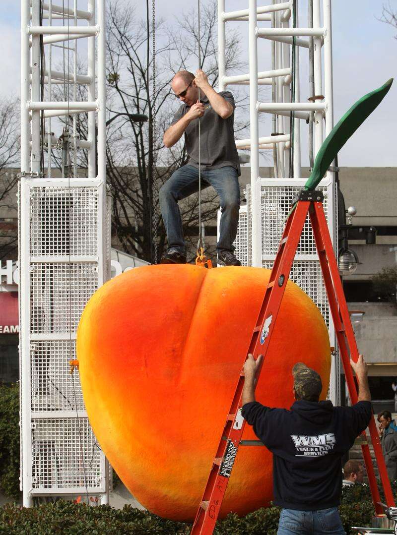 FILE - Entertainment Design Group project manager Gary Seputis stands on the giant peach as he positions himself before he attaches two leaves in preparation for the 2012 Peach Drop at Underground Atlanta Friday, Dec 30, 2011, in Atlanta. ( Jason Getz/Atlanta Journal-Constitution via AP)