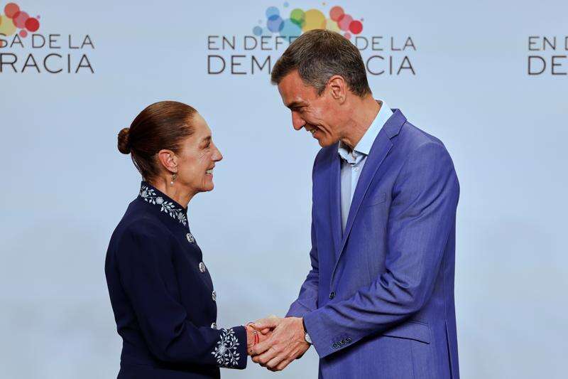 Spain's Prime Minister Pedro Sanchez, right, greets Mexican President Claudia Sheinbaum at the Meeting in Defence of Democracy summit in Barcelona, Spain, Saturday, April 18, 2026. (AP Photo/Joan Monfort)