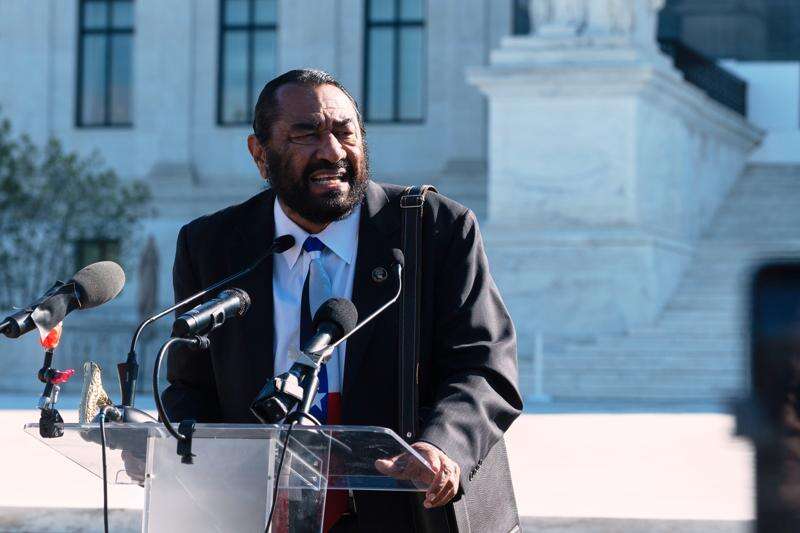 Rep. Al Green, D-Texas, speaks to voting rights activists outside the Supreme Court in Washington, early Wednesday, Oct. 15, 2025, as the justices prepare to take up a major Republican-led challenge to the Voting Rights Act, the centerpiece legislation of the Civil Rights Movement. (AP Photo/Cliff Owen)