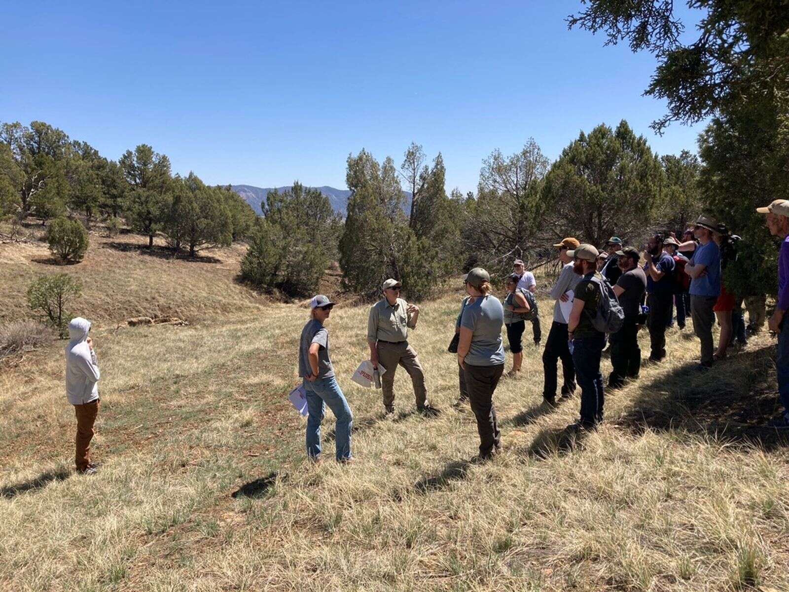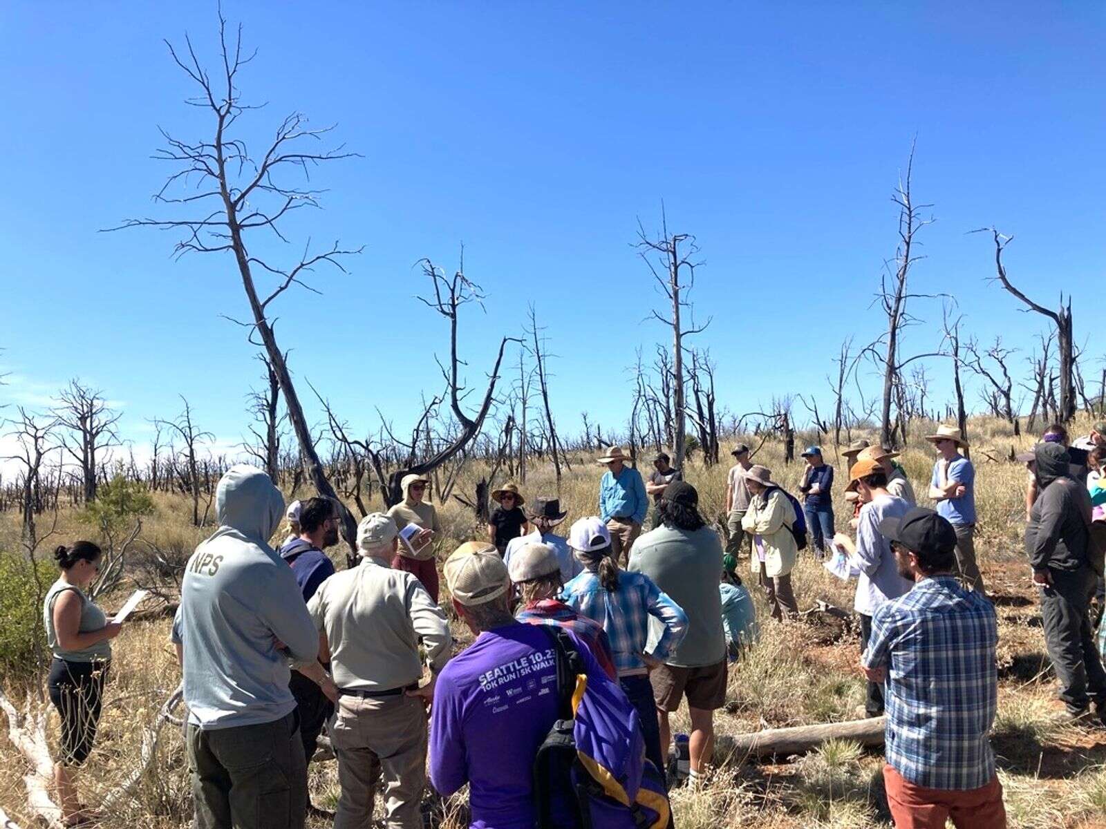 Participants gather to tour a burn scar at Mesa Verde National Park to learn about wildfire impacts and recovery. The event was last year's Pinyon Juniper Symposium, coordinated with Dolores Watersheds Collaborative and Mancos Conservation District. (Courtesy of Wildfire Adapted Partnership)