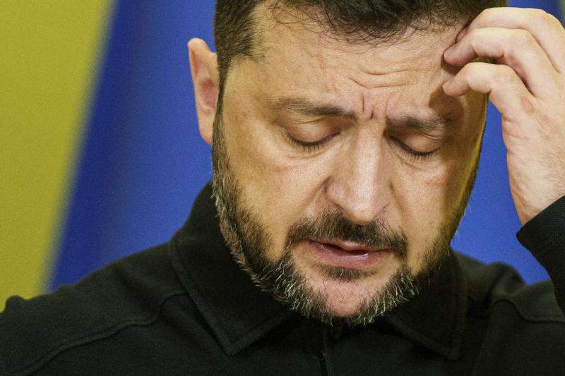 Ukraine's President Volodymyr Zelenskyy speaks during a joint press conference with European Parliament President Roberta Metsola in Kyiv, Ukraine, Wednesday, Sept. 17, 2025. (AP Photo/Evgeniy Maloletka)