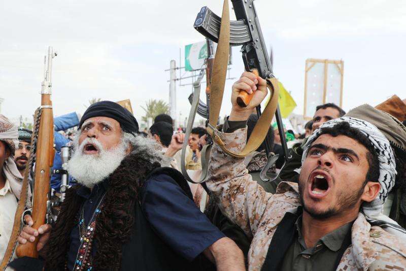Houthi supporters chant slogans against Israel and the United States during a rally, in Sanaa, Yemen, Friday, Feb. 6, 2026. (AP Photo/Osamah Abdulrahman)