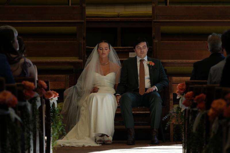 He in a dark suit, she in a white wedding dress, they sat on chairs upfront facing hundreds of guests in wooden pews. Eyes shut, they held a long period of silence broken only when they stood to exchange their vows. Like other Quaker weddings, it was a self-uniting ceremony: They married each other, without an officiant. At the end, the guests lined up to sign, as witnesses, a marriage certificate.